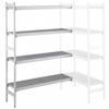 Köşe montajı için. 4 katlı raf seti, panjurlu polietilen bölmeli raflar (derinlik=373 mm). Alüminyum (20 mikron) yan dikmeler (yükseklik=1700 mm). Ayarlanabilir ayaklar. Lineer bir raf ünitesiyle kombine edilebilir.