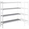 Köşe montajı için. Jaluzili bölmeli polietilen raflara sahip 4 katlı raf seti (derinlik=373 mm). Alüminyum (20 mikron) yan dikmeler (yükseklik=1700 mm). Ayarlanabilir ayaklar. Lineer raf ünitesiyle kombine edilebilir