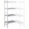 Köşe montajı için. Jaluzili bölmeli polietilen raflara sahip 4 katlı raf seti (derinlik=475 mm). Alüminyum (20 mikron) yan dikmeler (yükseklik=1700 mm). Ayarlanabilir ayaklar. Lineer raf ünitesiyle kombine edilebilir
