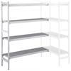 Köşe montajı için. Jaluzili bölmeli polietilen raflara sahip 4 katlı raf seti (derinlik=475 mm). Alüminyum (20 mikron) yan dikmeler (yükseklik=1700 mm). Ayarlanabilir ayaklar. Lineer raf ünitesiyle kombine edilebilir