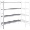 Köşe montajı için. Jaluzili bölmeli polietilen raflara sahip 4 katlı raf seti (derinlik=475 mm). Alüminyum (20 mikron) yan dikmeler (yükseklik=1700 mm). Ayarlanabilir ayaklar. Lineer raf ünitesiyle birlikte kullanılabilir