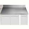 304 AISI paslanmaz çelikten yapılmış 40 mm yüksekliğindeki çalışma tezgahı, ses yalıtım malzemesinden yapılmış 18 mm'lik bir alt panele sahiptir. Ön ve arka uzunlamasına paslanmaz çelik C kanallı takviye. Su sızıntısını önlemek için çapaksız özel şekilli ön profil. Tamamen kaynaklı ve düzgün cilalı köşeler. 45° üst açılı ve tamamen kaynaklı kenarlara sahip 100 mm kutulu ağır hizmet tipi sıçrama koruması. Çalışma tezgahları braketlere monte edilebilir,900 mm çalışma yüksekliği elde etmek için ayaklar veya tabanlar.