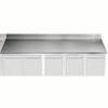 304 AISI paslanmaz çelikten yapılmış 40 mm yüksekliğindeki çalışma tezgahı, ses yalıtım malzemesinden yapılmış 18 mm'lik bir alt panele sahiptir. Ön ve arka uzunlamasına paslanmaz çelik C kanallı takviye. Su sızıntısını önlemek için çapaksız özel şekillendirilmiş ön profil. Tamamen kaynaklı ve düzgün cilalı köşeler. 45° üst açılı ve tamamen kaynaklı kenarlara sahip 100 mm kutulu ağır hizmet tipi sıçrama koruması. Çalışma tezgahları, 900 mm'lik bir çalışma yüksekliği elde etmek için braketlere, ayaklara veya tabanlara monte edilebilir.