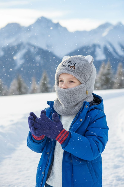 Peluş Çocuk Sevimli Ayıcık Kar Maskesi Sürper Hero 3-9 Yaş Çocuk Bere Gri