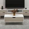 Kapağı, kulpsuz tasarımıyla sade ve temiz bir görünüm sunar; açma işlemi için ergonomik bir alan bırakılmıştır. Kulba ihtiyaç duymadan açılan bu sade kapak, minimal ve modern bir estetik yaratır. Alt rafı ise kitaplar, dergiler veya dekoratif objeler için pratik bir depolama alanı sağlar.