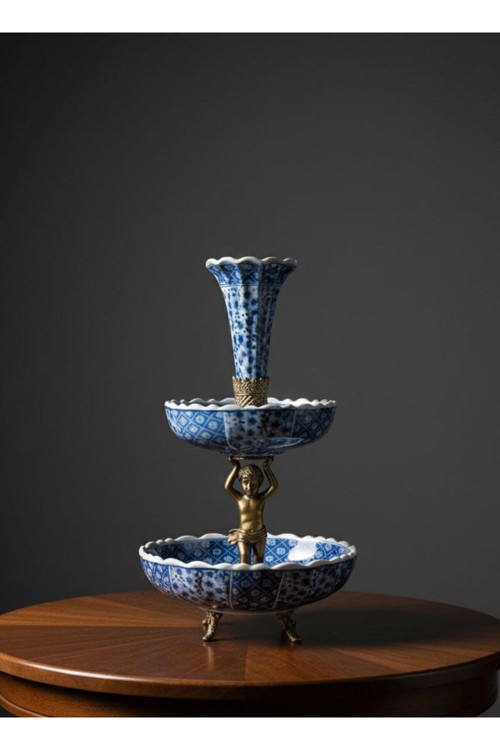 Gördüğünüz bu obje, hem dekoratif hem de işlevsel özellikler taşıyan, klasik ve vintage tarzda tasarlanmış iki katlı bir sunumluk (veya meyvelik/çerezlik) ile tepesinde bir vazodan oluşan karma bir parçadır.