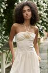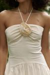 Asimetrik, straplez ve boyundan bağlamalı midi elbise. Gögüğ gül aksesuar detaylı, etek ucu balon tasarım. Yandan gizli fermuarlı.