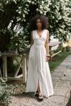 Derin 'V' yaka ve yırtmaç detaylı, cap kol, göğüs ve eteği büzgülü, korsajlı maxi elbise.
