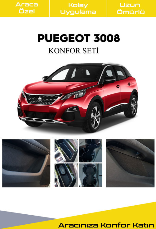 PEUGEOT 3008 KONFOR SETİ İLE ARACINIZA DEĞER KATIn Paket İçeriği Kol Dayama içi Bardaklık Tabanları 4 Kapı Cebi için kumaş Kaplama Renk Tercihleri Siyah PEUGEOT 3008 Konfor Seti ile hassas cihazlarınızı koruyun, tıkırtılara son verin, premium görünüme kavuşun.
