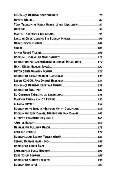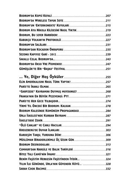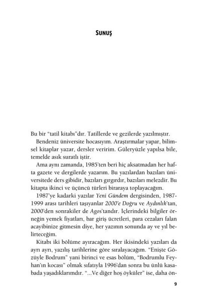 Ama sadece o kadar da değil. Bu kitap dört başı mâmur bir tatil kitabı. Hem tatilde rahat rahat, sereserpe okunacak cinsten olması bakımından. Hem de Türkiye’deki sayfiye ortamını, tatil alışkanlıklarını, tatil mitoslarını ve “Türk insanı”nın tatil hallerini mizahî bir yaklaşımla tasvir etmesi bakımından. Zaten sadece Bodrum yok bu yazılarda, başka seyahatlerden, başka eğlence-muhabbet “deneyimlerinden” de kareler var.