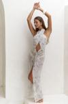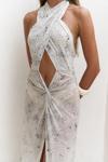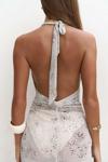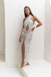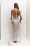 Boyundan bağlamalı, derin V yaka uzun elbise. Vücuda oturan formda, desenli ve