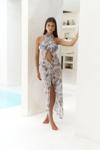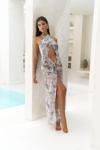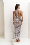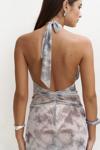 Boyundan bağlamalı, derin V yaka uzun elbise. Vücuda oturan formda, desenli ve