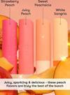 Sulu, ışıltılı ve lezzetli -- Bu şeftali aromaları gerçekten de en iyileri. Bu dudak balsamı seti, Strawberry Peach, Juicy Peach, Sweet Peachsicle ve White Sangria aromalarını içerir.