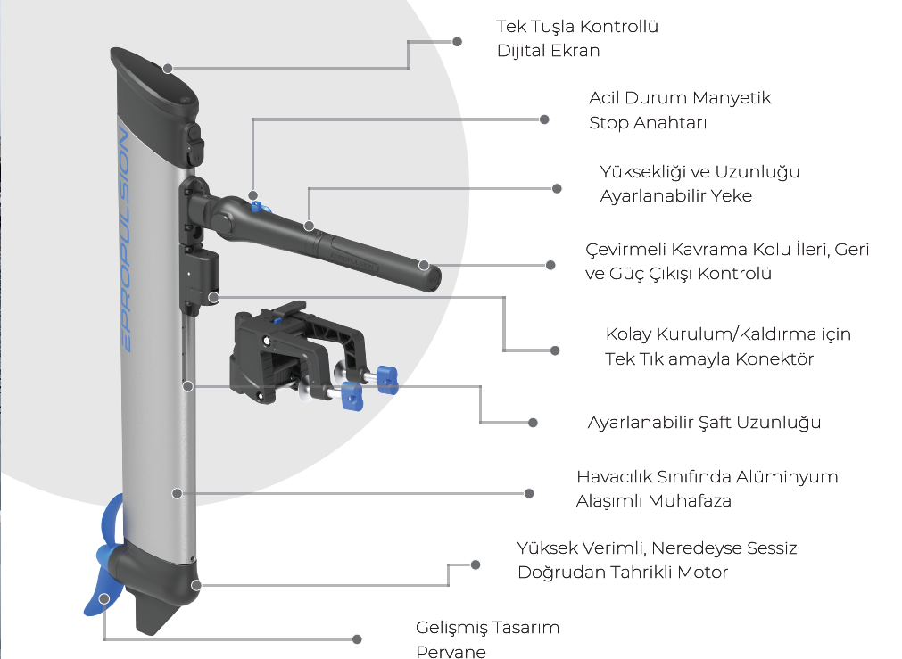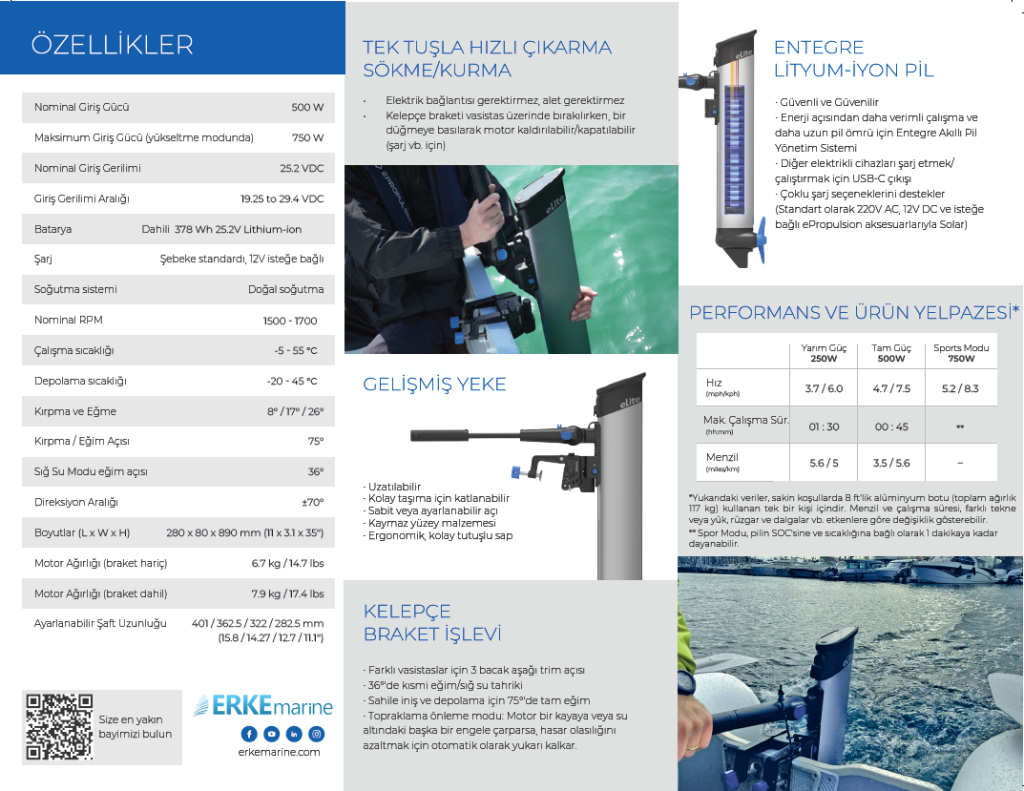 Şişme Botlar ve sportif yelkenli tekneler için tasarlanan 500W motor ile 2,2hp?lık dıştan takmalı motorlara muadildir.