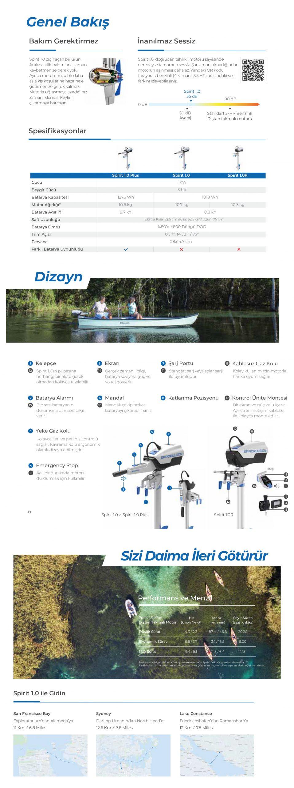 ePropulsion?ın en çok satan serisi Spirit 1.0?dır. Modüler dizayn prensibi sayesinde yalnızca 18kg ve 1276 Wh lityum-iyon bataryaya sahiptir. Kompakt ölçüsüne rağmen etkileyici 3 Beygirlik bir performans sağlamakta ve bu sayede hafif hizmet tipi olarak kullanılmaktadır.