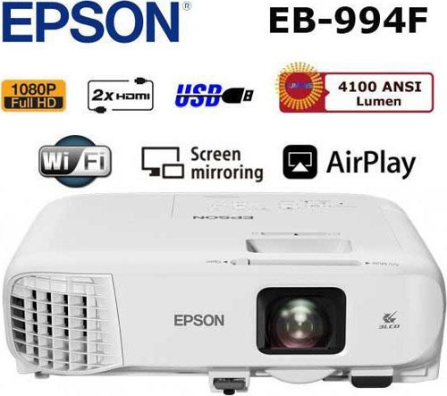 EPSON EB-994F: Full HD 1080p, 4100 lümen, Kablosuz Bağlantılı (WiFi, Miracast, Airplay), Çift HDMI, Network, USB Projeksiyon Cihazı