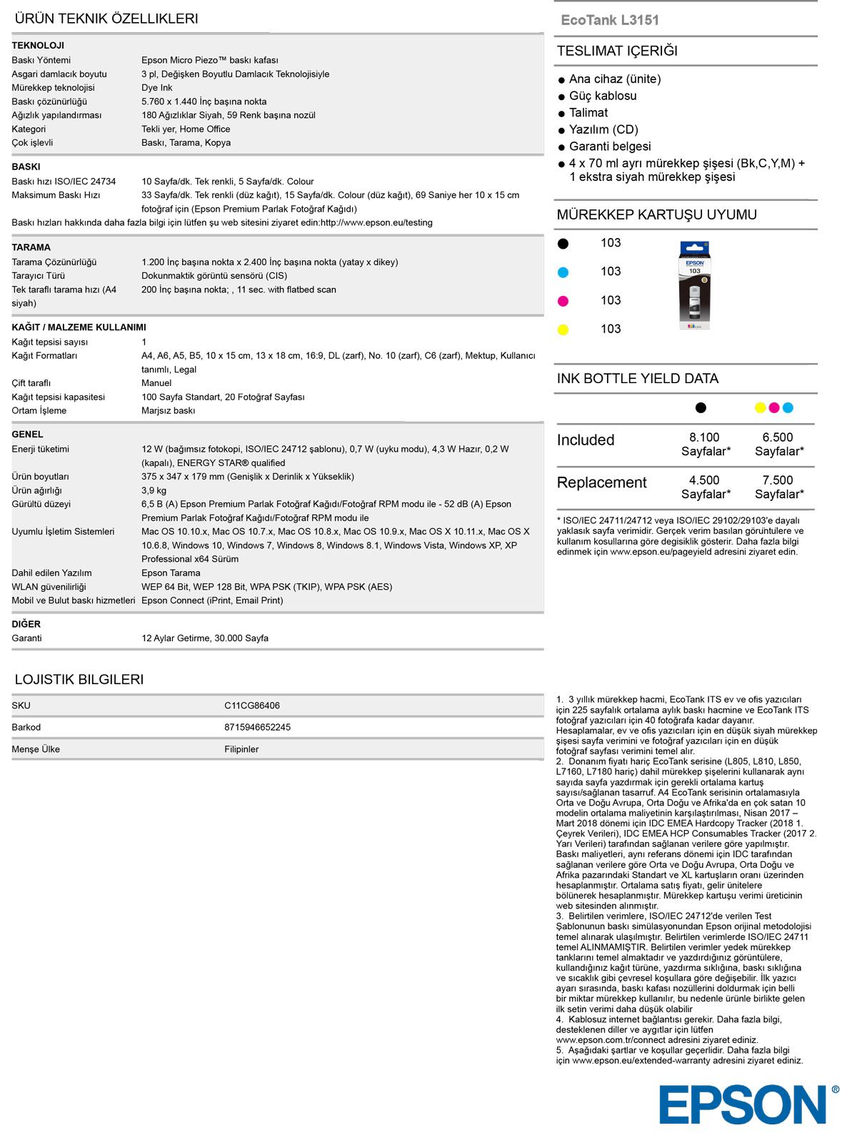 - Epson L3150 Çok Fonksiyonlu Yazıcı
