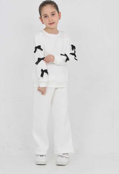 Kız Çocuk 3 İplik Şardonlu Kurdele Detaylı Basic Sweatshirt-Bol Kesim Palazzo Eşofman Takım