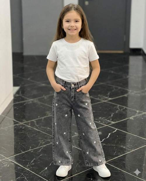 Erdem Kids Kız Çocuk Pamuklu Beli Lastikli Jean Pantolon Rahat Kalıp Geniş Bol Paça Yıldız Nakışlı Kot Pantolon