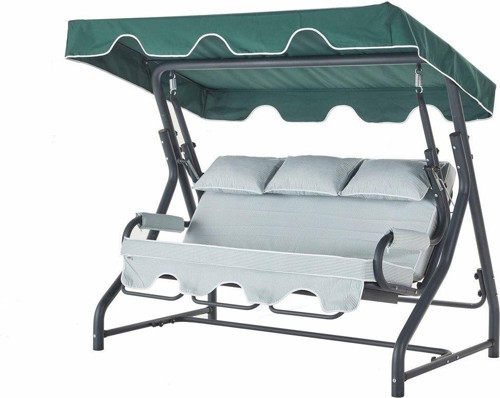 Salvia Bahçe Salıncağı - 3 Kişilik - Yeşil Çizgili Minder - Panama Kumaş - Yatarlı Salvia model 3 kişilik salıncak çelik rulmanı sayesinde ses çıkarmaz ve uzun ömürlüdür. Yatarlıdır. Özel tasarım ayak uzatma kızakları ile ekstra konfor sağlar. Baş dayama yastıkları vardır. 60'lık boruları tok bir görünüm sunar, dayanıklıdır. 7mm kalınlığındaki 8 boğum krom kaplı çelik yay kullanarak zorlu mevsim koşullarına uyumlu hale getirilmiştir. Elektrostatik boya kullanılmıştır. Fermuarlı üretilen minderler kolay takılıp çıkarılabileceği için yıkanarak temizlenebilir, dilerseniz ıslak bez ile silerek de temizleyebilirsiniz. Ürün tek koli içerisinde demonte olarak gönderilecektir. İçindeki kılavuz ile evde kendiniz rahatça kurulumunu yapabilirsiniz.