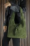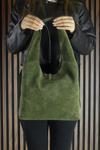 Haki Hakiki Dana Süet Püsküllü Manyetik Kapaklı Orta Boy Günlük Omuz Çantası