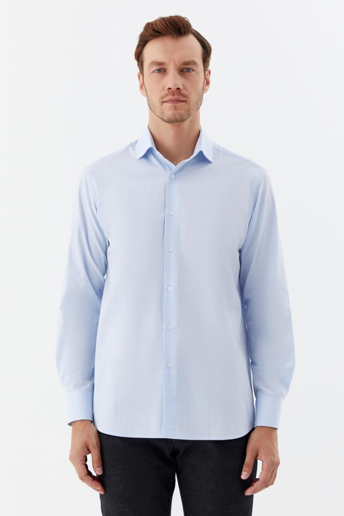 Açık mavi renk desenli erkek gömlek, yarım İtalyan yaka tasarımı ve regular fit kesimiyle modern bir şıklık sunar. %65 polyester ve %35 pamuk karışımı dokuma kumaşı, gün boyu rahat ve konforlu bir kullanım sağlar. Uzun kol ve manşet detayları gömleğe klasik bir zarafet katarken, jakarlı desen tasarımı gömleğe sofistike bir dokunuş kazandırır. İş hayatında veya smart casual kombinlerde rahatlıkla tercih edilebilecek, zamansız ve şık bir parçadır.