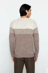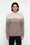 Ürün Özellikleri: Fitted kalıp, akrilik materyal, renk bloklu desen, bisiklet yaka, standart kol, triko kumaş, bej renk, baskısız tasarım.
