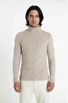 Ürün Özellikleri: Fitted kalıp, akrilik/polyester/viskoz/pamuk/yün materyal, fitilli desen, balıkçı yaka, uzun kol, triko kumaş, ekru renk, baskısız tasarım.