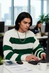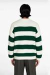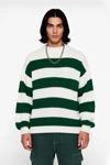 Ürün Özellikleri: Oversize kalıp, akrilik materyal, çizgili desen, bisiklet yaka, standart kol, triko kumaş, kahverengi ve krem çizgili renk.