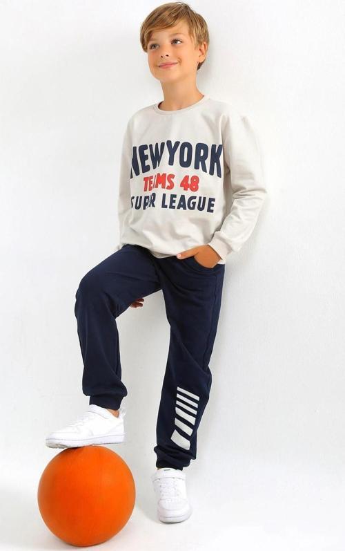 Ekru Pamuklu Kalın İçi Tüylü Yumuşak Dokulu Standart Fit Baskılı Erkek Çocuk Eşofman Takım - 11233 - Image 1