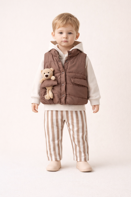 Kış sezonunun en şık ve modern erkek bebek kombinlerinden biri! 9-24 ay arası erkek bebekler için tasarlanan bu 3’lü takım, hem sıcak tutar hem de gün boyu rahatlık sağlar. Takım İçeriği: • Şişme yelek • Kapüşonlu %100 pamuk iki iplik sweatshirt • Çizgili gabardin beli lastikli pantolon Yumuşak dokulu %100 pamuk sweatshirt bebeğinizin hassas cildine uygundur ve terletmez. Şişme yelek serin havalarda ekstra koruma sağlar. Gabardin kumaş pantolon ise hem dayanıklı hem de şık görünüm sunar. Beli lastikli yapısı sayesinde rahat kullanım sağlar ve kolay giydirilir. Günlük kullanım, dış çekim kombinleri ve özel günler için ideal bir settir. ✔ Yaş Aralığı: 9-12-18-24 Ay ✔ Mevsim: Sonbahar / Kış ✔ Kalıp: Rahat kesim ✔ Kumaş: %100 Pamuk (Sweatshirt) – Gabardin Pantolon Şıklık ve konforu bir arada isteyen anneler için tasarlanmıştır.