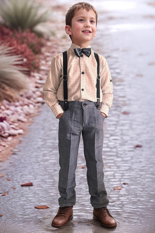 Erkek Bebek Desenli Gömlek, Papyon ve Askılı Mavi Pantolon Alt Üst Takım