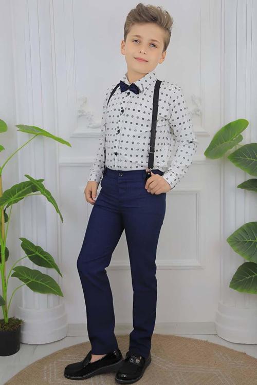 Erkek Çocuk Desenli Gömlek, Papyon ve Askılı Lacivert Pantolon Alt Üst Takım