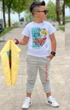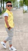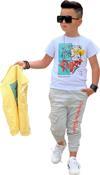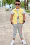 Erkek Çocuk Kaplan Detaylı T-shirt Sırt Baskılı Kolsuz Sarı Jean Ceket Kargo Cepli Alt Üst Takım