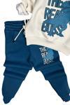 Erkek Çocuk Önü Yazı Ve Dino Baskılı Kapşonlu Sweatshirt 3 İplik Mavi Eşofman Takım