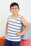 - Üst Parça: Sıfır kollu, beyaz zemin üzerine mavi yatay çizgili atlet