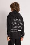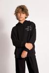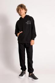 Erkek çocuklara özel tasarlanan siyah kapüşonlu baskılı eşofman takımı, günlük kullanımda hem şıklık hem de rahatlık sunar