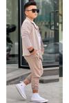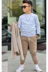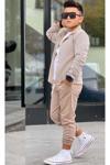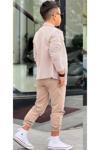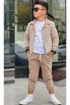 Erkek Çocuk Su Yolu Çizgili Ceket Penye Kazak 2 İplik Pantolon Krem Alt Üst Takım