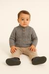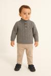 Kış ve serin havalar için ideal bu 2’li takım; kabartmalı örgü desenli, yüksek yakalı (polarlı iç astarlı) triko kazak ile esnek yapılı bej pantolonu bir araya getirir. Ahşap görünümlü düğme detayları ve temiz dikişleriyle şık bir siluet sunar. Okul, oyun, doğum günü ya da aile buluşmalarında hem rahat hem de derli-toplu bir görünüm sağlar. Kazak tek başına jeanlerle, pantolon da gömlek veya sweatshirtlerle kolayca kombinlenir.