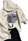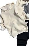Ürün bilgisi: Kapüşonlu ve üzeri desen ve yazı baskılı 3 iplik kazak.