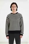 Ürün Özellikleri: Oversize kalıp, polyester pamuk viskoz karışımı materyal, çizgili desen, bisiklet yaka, standart uzun kol, fitilli triko kumaş, siyah krem renk, baskısız tasarım.