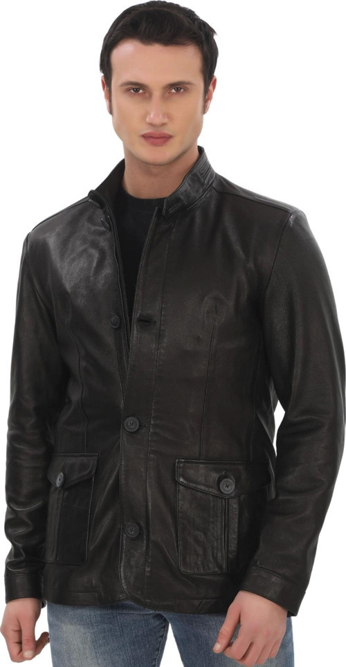 Ersefa Erkek Hakiki Kuzu Derisi Ceket Siyah Şık ve Klasik Deri Mont Düğmeli ve Fermuarlı Modern Tasarım