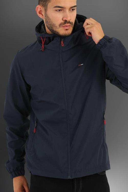 Erkek Lacivert Içi Suya Dayanıklı Kapüşonlu Cepli Spor Yağmurluk.