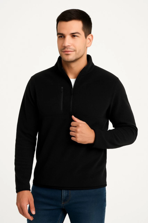 Erkek Polar Kazak – Dik Yaka, Yarım Fermuarlı, Fermuarlı Göğüs Cepli, Siyah Biyeli, Kışlık Rahat Regular Fit Günlük Model - Siyah