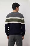 Ürün Özellikleri: Fitted kalıp, akrilik polyester yün karışımı materyal, renk bloklu desen, bisiklet yaka, standart kol, triko kumaş, gri lacivert yeşil beyaz renk, baskısız tasarım.