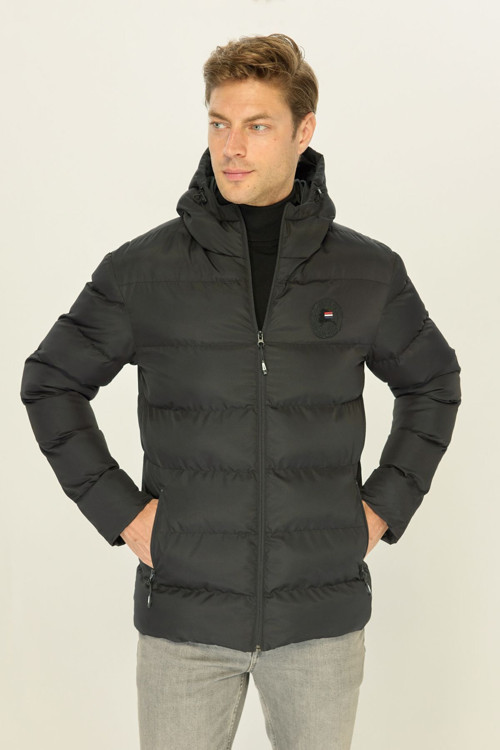Erkek Siyah Su Ve Rüzgar Geçirmez Kapüşonlu Kışlık Şişme Mont.