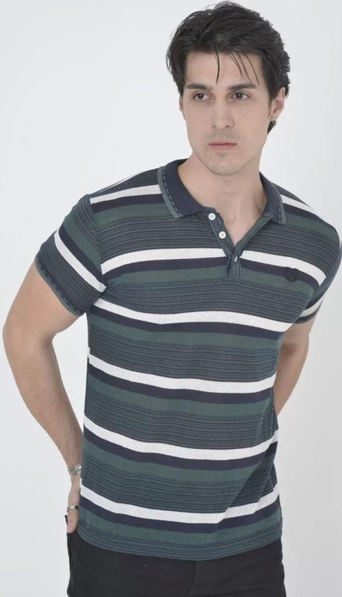 Erkek Yakalı Slim Fit Dokuma Çizgili T-Shirt - Haki