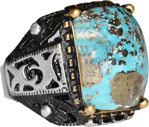Erkekler için tasarlanmış Gümüş Yüzüğümüzün zamansız zarafetini keşfedin; muhteşem doğal turkuaz taşla süslenmiştir. Canlı mavi rengi ve benzersiz desenleri ile tanınan turkuaz, dayanıklılığı ve lüks bir görünümü garanti eden yüksek kaliteli 925 ayar gümüş içine yerleştirilmiştir.