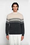 Ürün Özellikleri: Fitted kalıp, akrilik materyal, etnik desen, bisiklet yaka, standart kol, triko kumaş, antrasit/bej renk, baskısız tasarım.