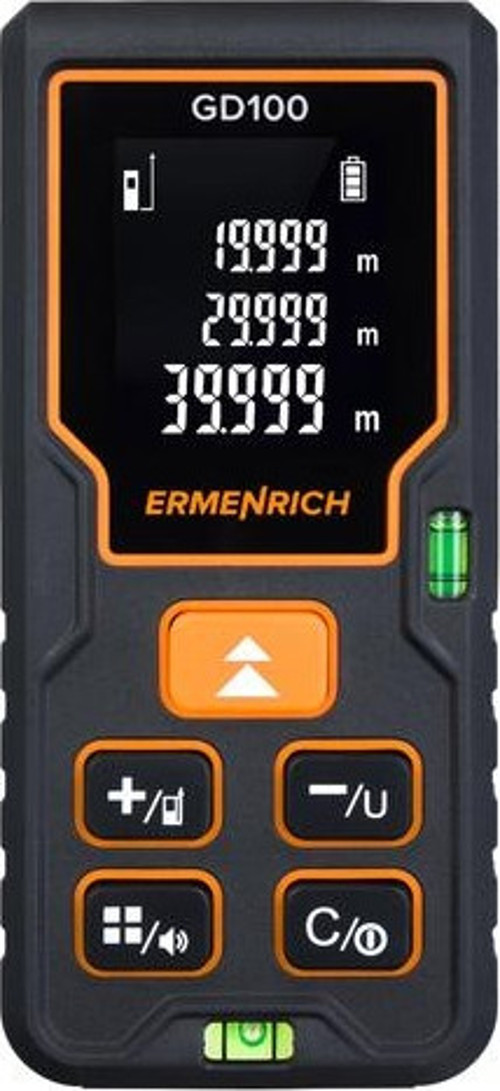 Ermenrich Reel GD100 Lazer Metre, makine mühendisliği, inşaat ve yenileme alanlarındaki çok çeşitli görevlerin üstesinden gelen çok işlevli bir cihazdır. En uygun olarak tek tarafı 100 metreye kadar olan büyük odaların doğrusal, alan ve hacim ölçümleri için kullanılır. Tek ölçümlere ek olarak, bir odayı otomatik olarak da tarayabilirsiniz. Veriler 3 satırlı LCD ekranda görüntülenir ve aynı anda 20 adede kadar sonuç grubu saklanabilir. Sesli uyarılar olmadan çalıştırılabilir.